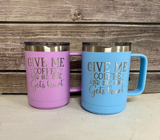 Our coffee cup is also engraved with the phrase "Give Me Coffee and No One Gets Hurt," a playful reminder that there's nothing quite like a good cup of coffee to kick-start your day. Whether you're a busy professional or just a coffee lover, this cup is the perfect way to enjoy your favorite beverage in style.